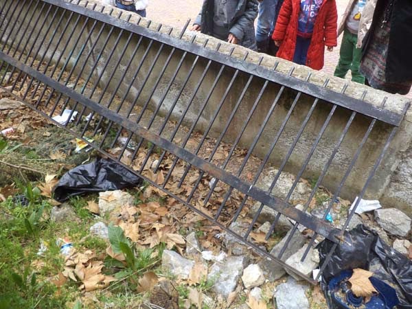 Αυτό το Σαββατοκύριακο, όμως, η βία που ασκήθηκε ήταν πρωτοφανής. Η εικόνα που αντίκρισαν οι δάσκαλοι και οι μαθητές του σχολείου το πρωί της Δευτέρας ήταν τραγική. Ένα μεγάλο κομμάτι από τα κάγκελα της αυλής “ξεριζώθηκε’, παίρνοντας μαζί του και κομμάτια από τον τοίχο. Δίπλα από τα πεσμένα κάγκελα,φυσικά,η νεολαία που “άραξε ‘ στον αύλειο χώρο,άφησε και πάλι ό,τι κατανάλωσε: Ποτά, απορρίμματα από φαγώσιμα, πλαστικά ποτήρια…
