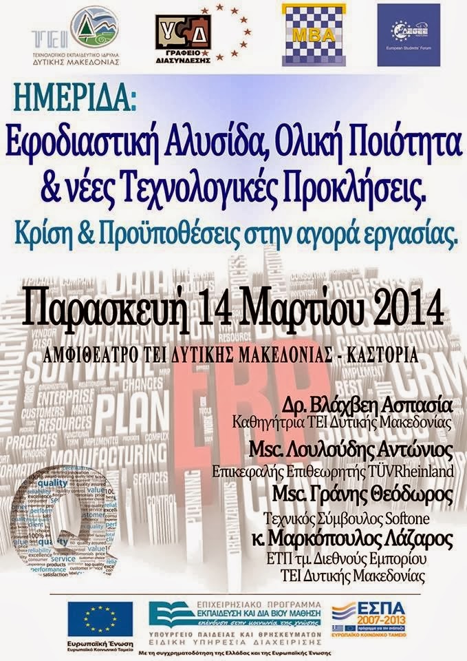 Η AEGEE KASTORIA έχει την τιμή να σας προσκαλέσει στην Ημερίδα που διοργανώνει στο ΤΕΙ Δυτικής Μακεδονίας στην Καστοριά, σε συνεργασία με το Γραφείο Διασύνδεσης και το Διιδρυματικό Πρόγραμμα Μεταπτυχιακών Σπουδών στη Διοίκηση Επιχειρήσεων, με θέμα: