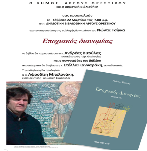 Ο Δήμος Άργους Ορεστικού και η Δημοτική Βιβλιοθήκη παρουσιάζουν τη συλλογή διηγημάτων του Νώντα Τσίγκα «Εποχιακός διανομέας»