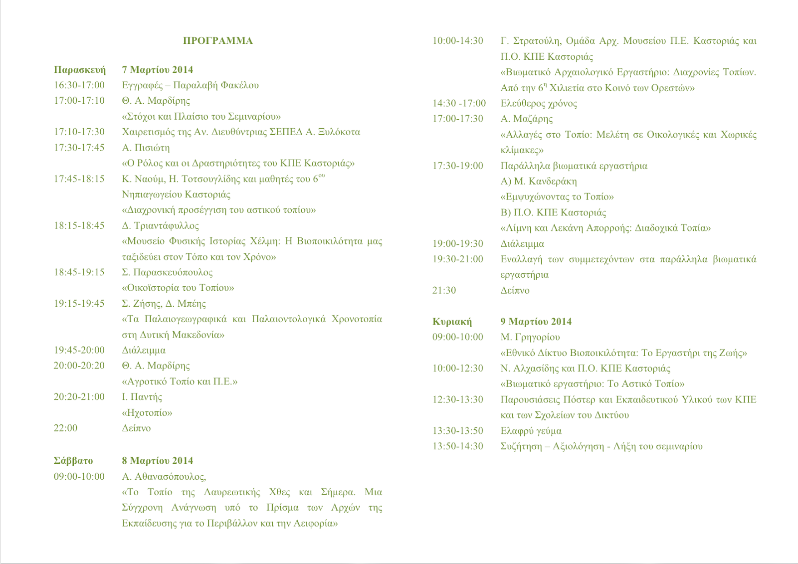 Τις εισηγήσεις της πρώτης ημέρας (Παρασκευή, 7/3/2014), που περιλαμβάνουν σημαντικά θέματα σχετικά με τη διάκριση Τόπου και Τοπίου, την παρουσίαση του Μουσείου Φυσικής Ιστορίας Χέλμη της Ζακύνθου, την Οικοϊστορία του Τοπίου, τα Παλαιογεωγραφικά και Παλαιοντολογικά Χρονοτοπία της Δυτικής Μακεδονίας, τις σχέσεις που αναπτύσσονται στο Αγροτικό Τοπίο, την έννοια και τη σημασία των Ηχοτοπίων, αλλά και τη διαχρονική προσέγγιση του αστικού τοπίου της πόλης μας από τους μαθητές του 6ου Νηπιαγωγείου Καστοριάς, μπορεί ελεύθερα να παρακολουθήσει όποιος ενδιαφέρεται από την τοπική κοινωνία, ανεξάρτητα από την επαγγελματική του απασχόληση.