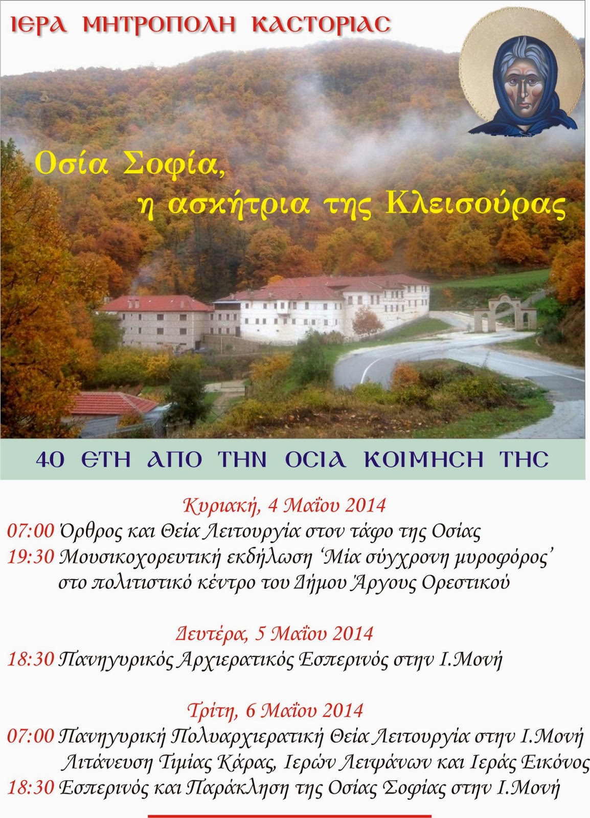 Γ. Παραμονή της εορτής, Δευτέρα 5 Μαίου, 6.30 το απόγευμα: Πανηγυρικός Αρχιερατικός Εσπερινός στο Μοναστήρι της Κλεισούρας – τόπος ασκήσεως της Αγίας Σοφίας – με τη συμμετοχή και άλλων Αρχιερέων της Εκκλησίας μας, του Ιερού Κλήρου, της Καθηγουμένης και των αδελφών της Ιεράς Μονής.