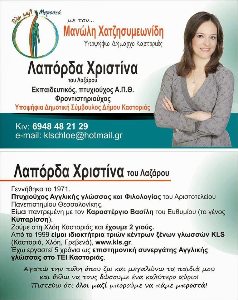 Αγαπητοί μου φίλοι, δε μπορώ να μένω άλλο αμέτοχη περιμένοντας πάντα από άλλους να κάνουν τη διαφορά, να προσφέρουν και να δημιουργήσουν! Αποφάσισα να συμμετέχω, αντί να γκρινιάζω για όσα θεωρώ ότι μπορούσαν να έχουν γίνει καλύτερα. Αποφάσισα να προσπαθήσω κι εγώ με τον τρόπο μου, να κάνω όλα όσα πιστεύω ότι μπορούν να γίνουν ώστε να κρατήσουμε τα παιδιά μας στον τόπο μας, ώστε ο Δήμος Καστοριάς να γίνει το κόσμημα που του αξίζει! Αποφάσισα να στηρίξω ανθρώπους που έδειξαν την αγάπη τους για τον τόπο και προσπάθησαν να κάνουν τη διαφορά. Αποφάσισα να προσπαθήσω να αλλάξω πράγματα προς το καλύτερο, να βοηθήσω τον τόπο μας! Τα προηγούμενα τριάμιση χρόνια ήταν μια πολύ καλή αρχή για τον νέο διευρυμένο Καλλικρατικό μας δήμο. Τα πέντε χρόνια που έρχονται πρέπει να είναι μια πολύ καλή συνέχεια!