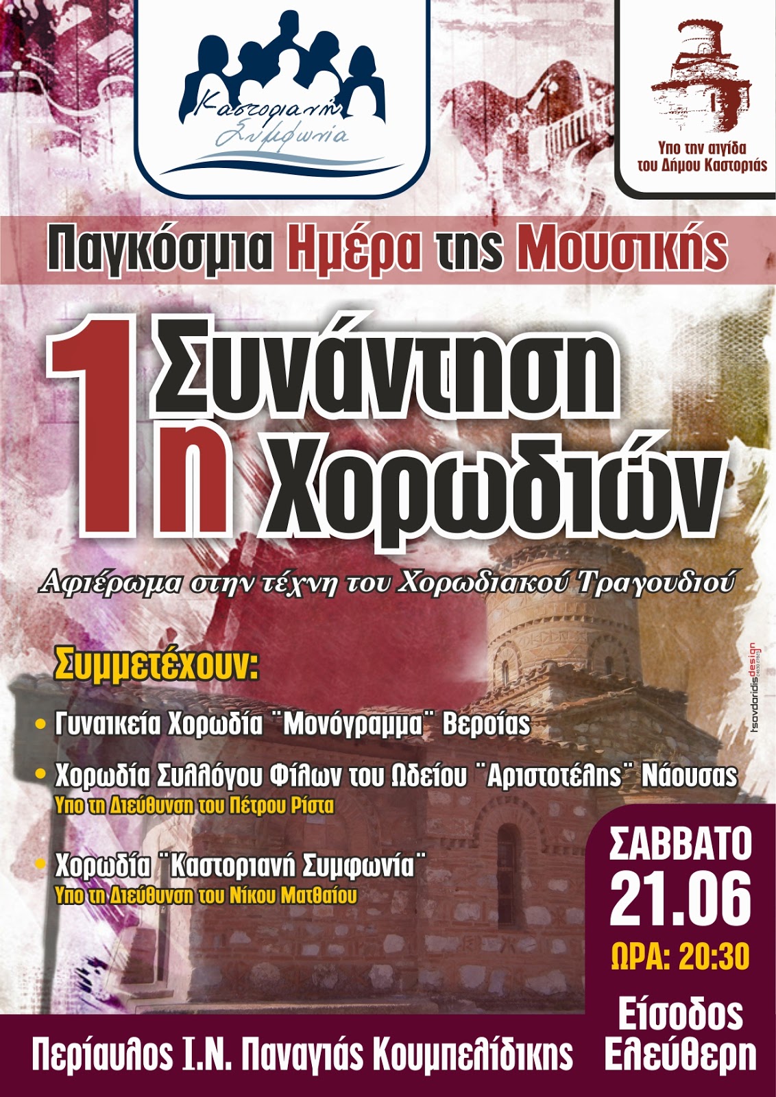 21η Ιουνίου ,πρόκειται να πραγματοποιηθεί το Σάββατο 21 του μηνός και ώρα 20: 30 μ.μ. στον αύλειο χώρο του Ι.Ν. Παναγίας Κουμπελίδικης μουσική βραδιά αφιερωμένη στην τέχνη του χορωδιακού τραγουδιού με τη συμμετοχή των :