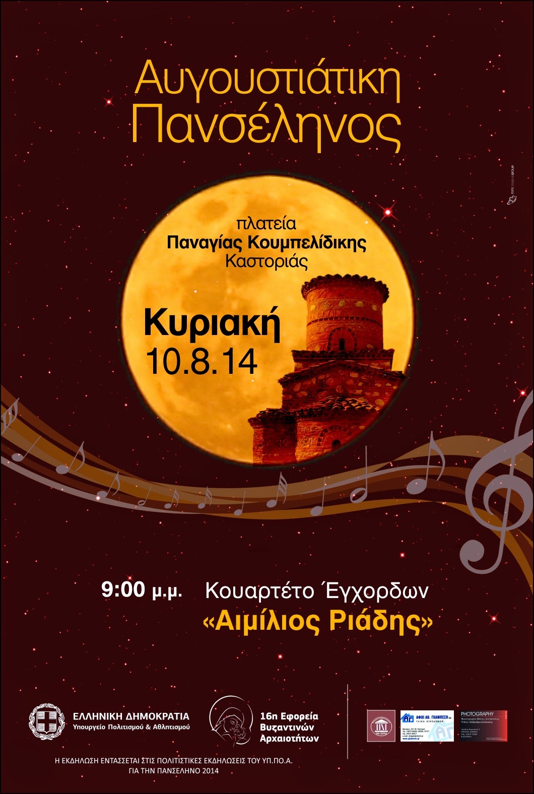 H 16η Εφορεία Βυζαντινών Αρχαιοτήτων σας προσκαλεί σε μουσική εκδήλωση στα πλαίσια των πολιτιστικών δράσεων του Υπουργείου Πολιτισμού & Αθλητισμού για την Πανσέληνο του Αυγούστου την Κυριακή 10 Αυγούστου 2014 και ώρα 9:00μ.μ. στην πλατεία της Παναγίας Κουμπελίδικης Καστοριάς.