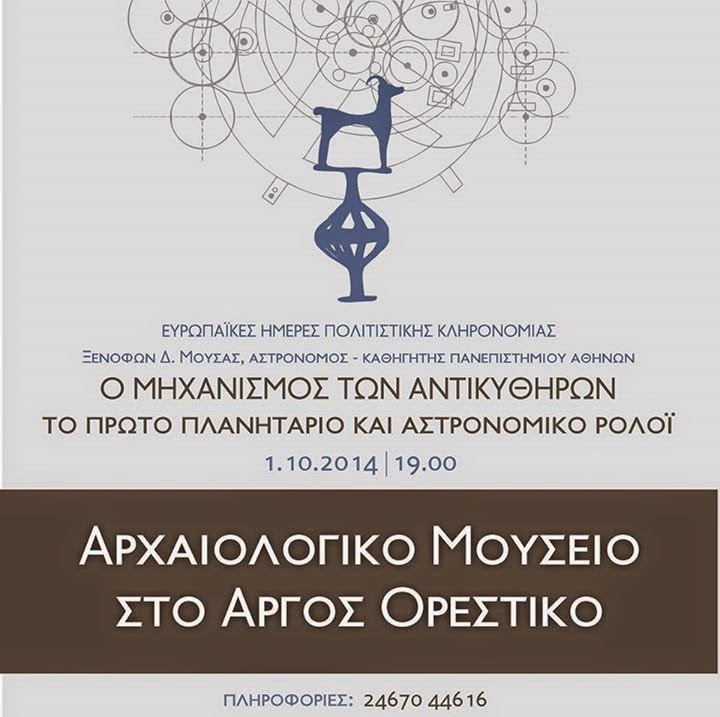 Ημερών Πολιτιστικής Κληρονομιάς 2014, προσκαλούν μαθητές και ενήλικες να γνωρίσουν την εξέλιξη της Επιστήμης της Αστροφυσικής … στην Εποχή των Αρχαίων Ορεστών … με επίκεντρο το ΜΗΧΑΝΙΣΜΟ ΤΩΝ ΑΝΤΙΚΥΘΗΡΩΝ
