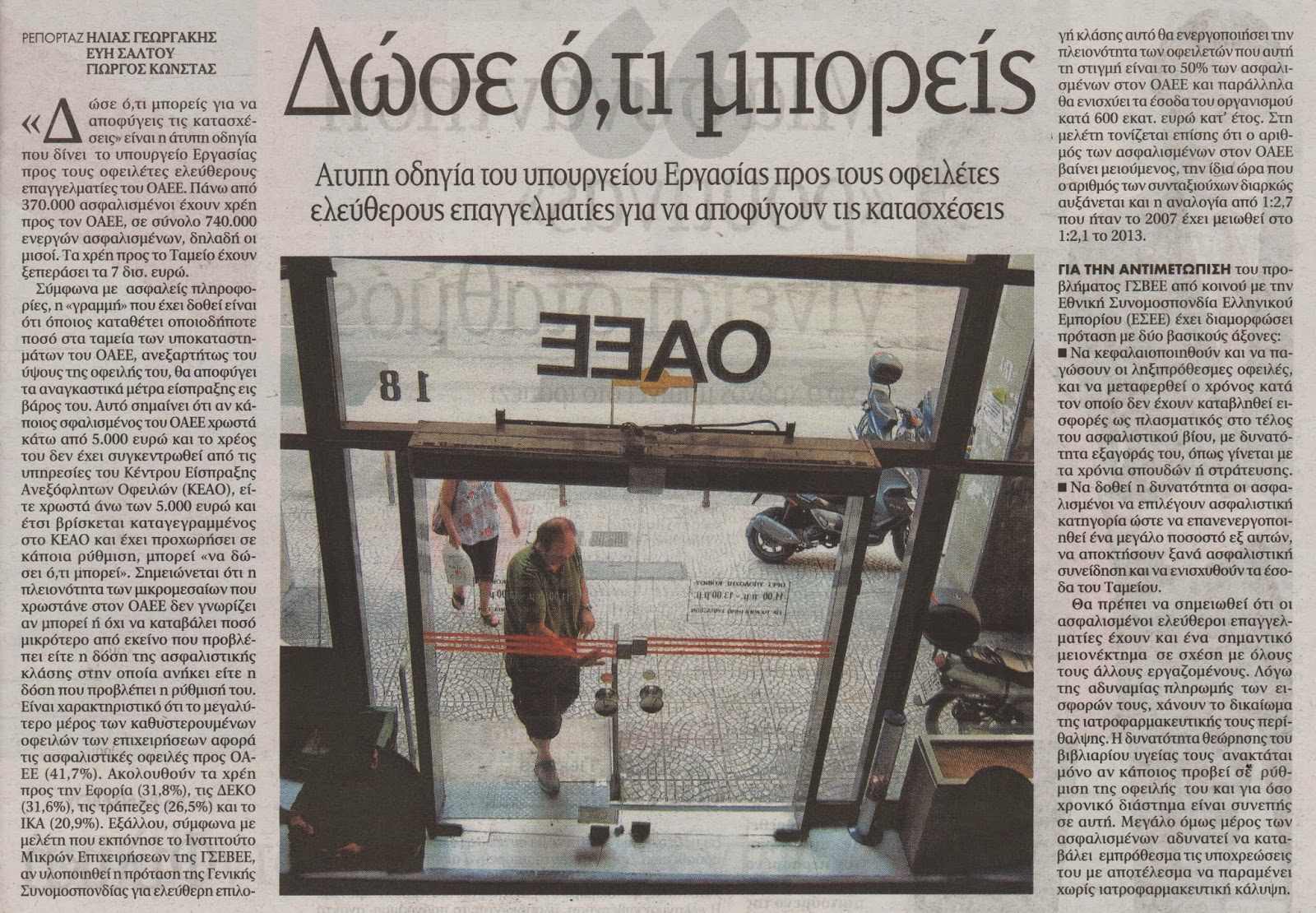 «Δώσε ό,τι μπορείς για να αποφύγεις τις κατασχέσεις» είναι η άτυπη οδηγία που δίνει το υπουργείο Εργασίας προς τους οφειλέτες ελεύθερους επαγγελματίες του ΟΑΕΕ. Πάνω από 370.000 ασφαλισμένοι έχουν χρέη προς τον ΟΑΕΕ, σε σύνολο 740.000 ενεργών ασφαλισμένων, δηλαδή οι μισοί. Τα χρέη προς το Ταμείο έχουν ξεπεράσει τα 7 δισεκ. ευρώ.