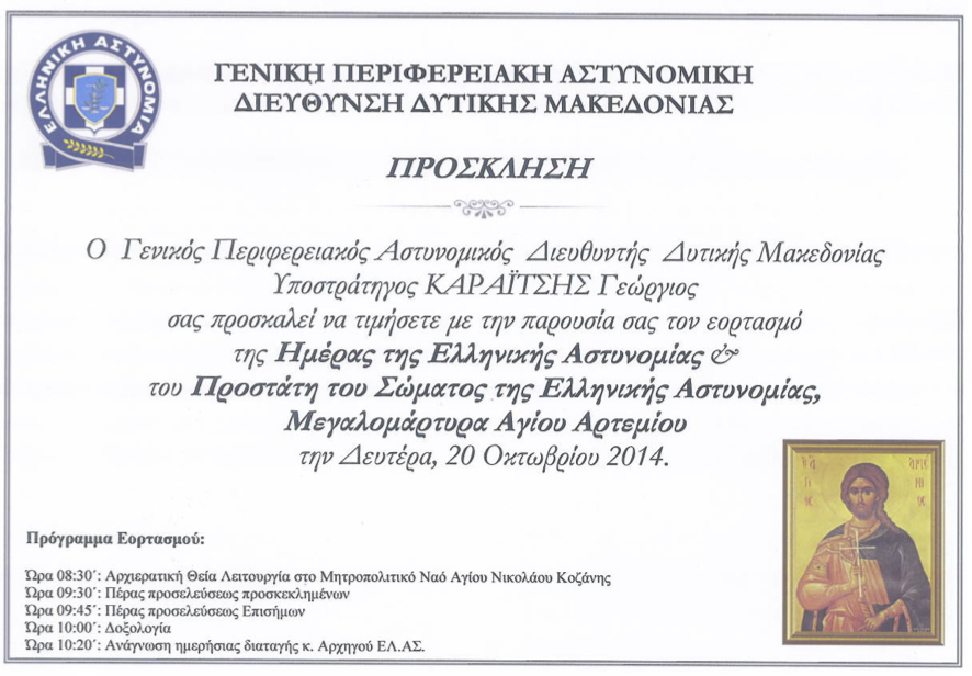 Πρόσκληση για τον εορτασμό της Ημέρας της Ελληνικής Αστυνομίας & του Προστάτη του Σώματος της Ελληνικής Αστυνομίας, Μεγαλομάρτυρα Αγίου Αρτεμίου.