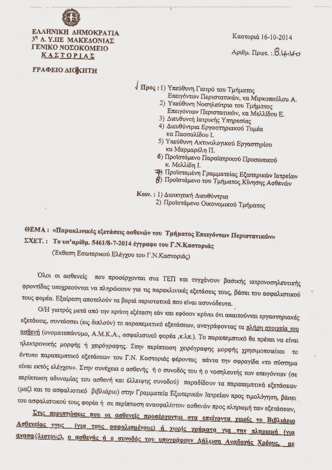 «Όλοι οι ασθενείς που προέρχονται στα ΤΕΠ (σ.σ. Τμήμα Επειγόντων Περιστατικών) και τυγχάνουν βασικής ιατρονοσηλευτικής φροντίδας υποχρεούνται να πληρώσουν για τις παρακλινικές εξετάσεις τους, βάσει του ασφαλιστικού τους φορέα. Εξαίρεση αποτελούν τα βαριά περιστατικά που είναι ασυνόδευτα» αναφέρει η εγκύκλιος με ημερομηνία 16 Οκτωβρίου 2014 της Διοίκησης Υγειονομικής Περιφέρειας Μακεδονίας που φέρνει στο φως το Ράδιο Καστοριά.