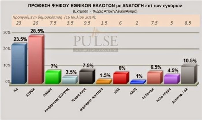 Με πέντε ποσοστιαίες μονάδες προηγείται ο ΣΥΡΙΖΑ έναντι της Νέας Δημοκρατίας, στην πρόθεση ψήφου και στην αναγωγή της πρόθεσης ψήφου επί των έγκυρων, σύμφωνα με νέα δημοσκόπηση της εταιρείας Pulse για λογαριασμό της εφημερίδας «Το Ποντίκι». Ο ΣΥΡΙΖΑ στην πρόθεση ψήφου συγκεντρώνει 27%, η Νέα Δημοκρατία 22%.