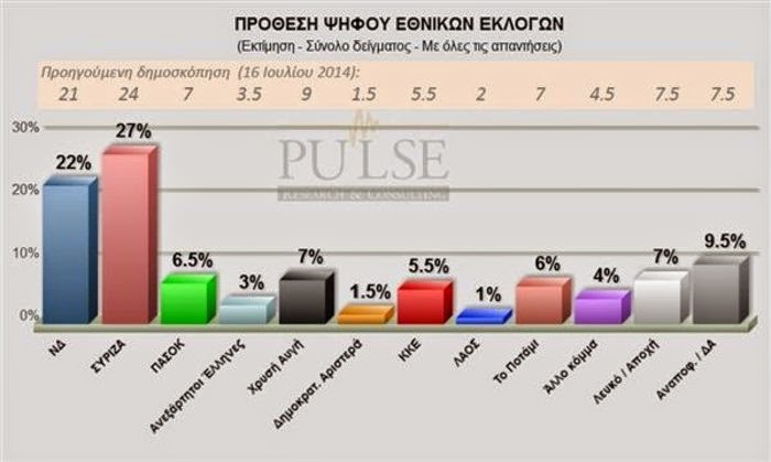 Με πέντε ποσοστιαίες μονάδες προηγείται ο ΣΥΡΙΖΑ έναντι της Νέας Δημοκρατίας, στην πρόθεση ψήφου και στην αναγωγή της πρόθεσης ψήφου επί των έγκυρων, σύμφωνα με νέα δημοσκόπηση της εταιρείας Pulse για λογαριασμό της εφημερίδας «Το Ποντίκι». Ο ΣΥΡΙΖΑ στην πρόθεση ψήφου συγκεντρώνει 27%, η Νέα Δημοκρατία 22%.