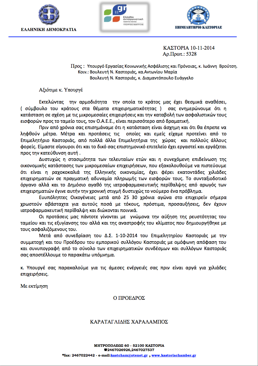 ΟΛΟΚΛΗΡΗ Η ΕΠΙΣΤΟΛΗ ΑΓΩΝΙΑΣ ΤΟΥ ΕΠΙΜΕΛΗΤΗΡΙΟΥ ΚΑΣΤΟΡΙΑΣ ΣΤΟΝ ΒΡΟΥΤΣΗ ΓΙΑ ΤΟΝ ΟΑΕΕ