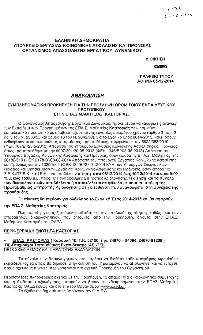 ΣΥΜΠΛΗΡΩΜΑΤΙΚΗ ΠΡΟΚΗΡΥΞΗ ΓΙΑ ΠΡΟΣΛΗΨΗ ΩΡΟΜΙΣΘΙΟΥ ΕΚΠΑΙΔΕΥΤΙΚΟΥ ΠΡΟΣΩΠΙΚΟΥ ΣΤΗΝ ΕΠΑ.Σ ΚΑΣΤΟΡΙΑΣ