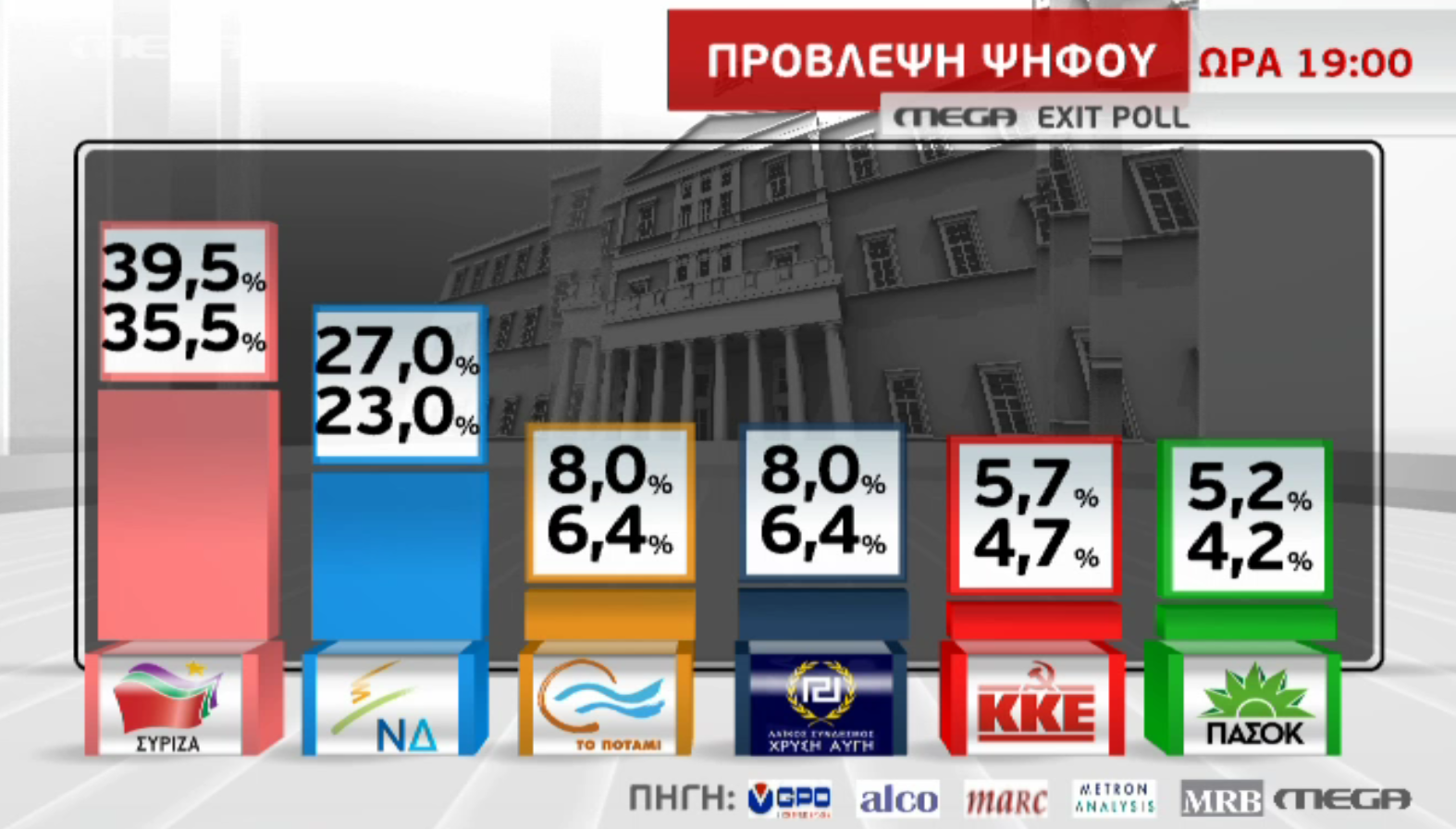 Συγκεκριμένα ο ΣΥΡΙΖΑ κινείται μεταξύ 35,5 και 39,5 %, ενώ η Νέα Δημοκρατία κυμαίνεται από 23
