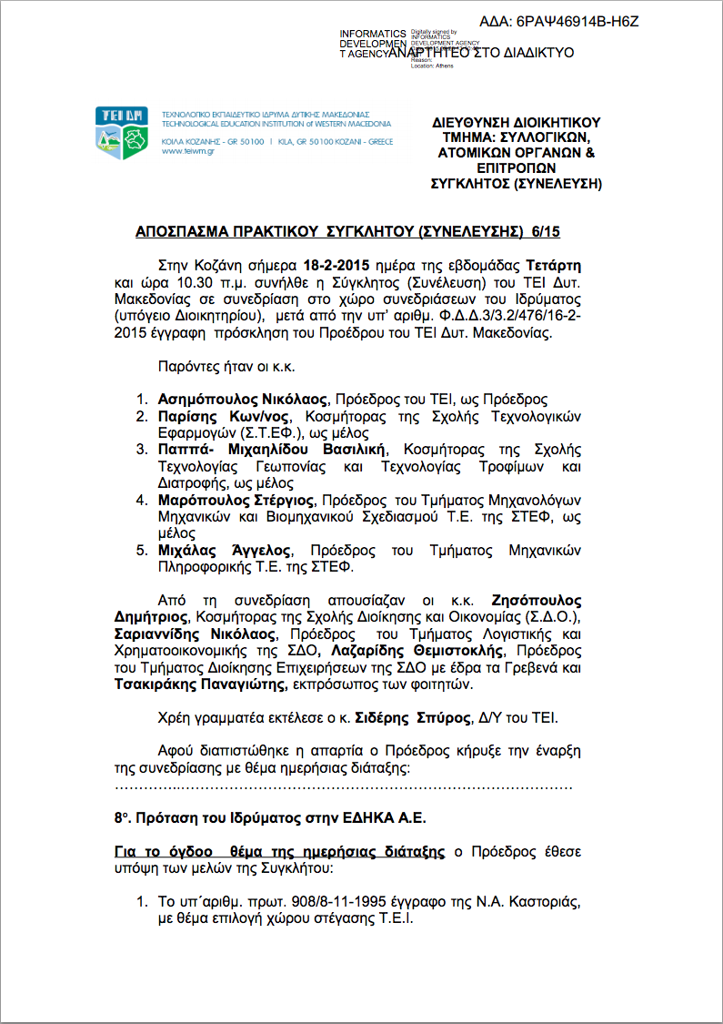 και ώρα 10.30 π.μ. συνήλθε η Σύγκλητος (Συνέλευση) του ΤΕΙ Δυτ.