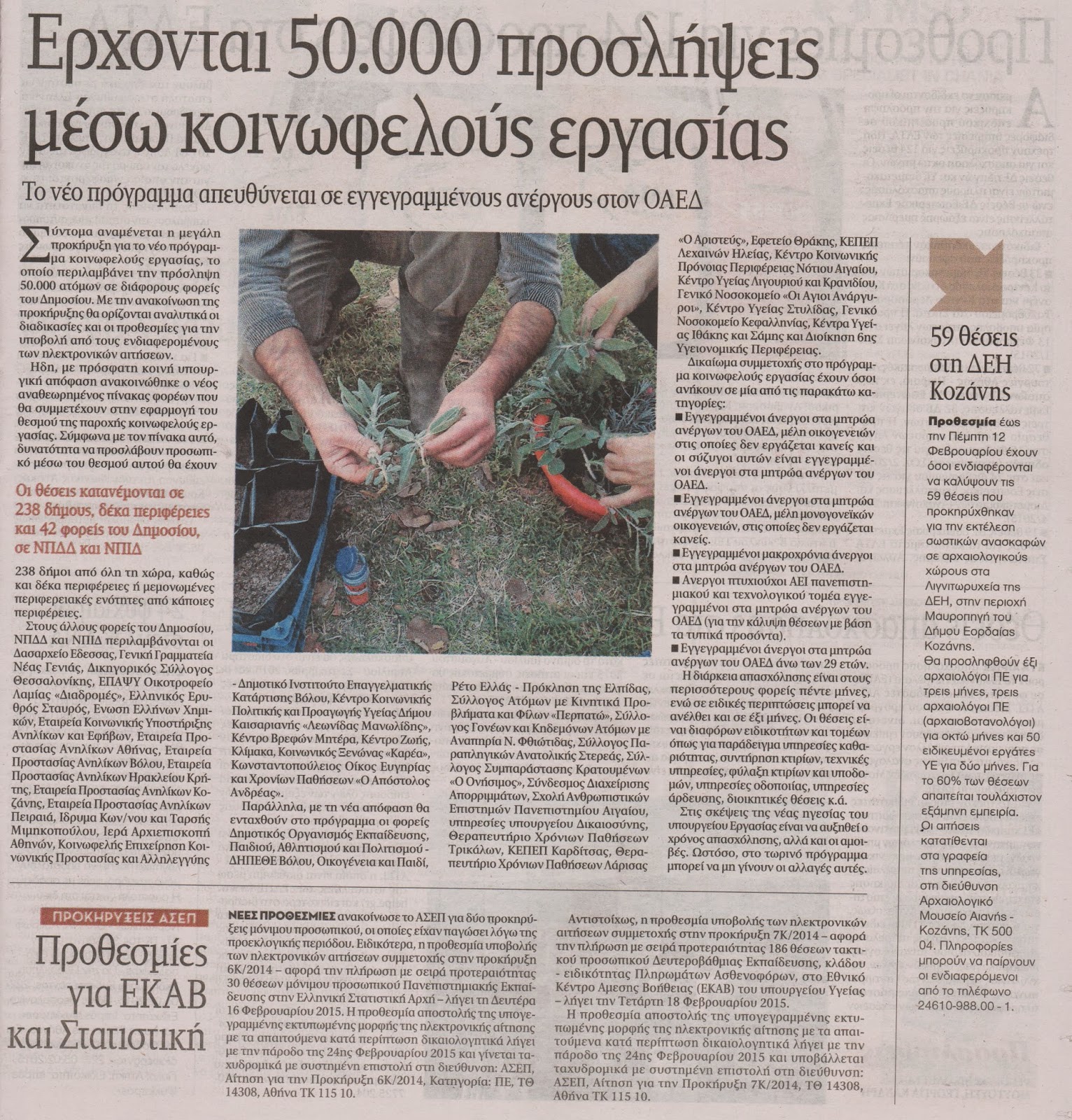 Σύντομα αναμένεται η μεγάλη προκήρυξη για το νέο πρόγραμμα κοινωφελούς εργασίας, το οποίο περιλαμβάνει την πρόσληψη 50.000 ατόμων σε διάφορους φορείς του Δημοσίου.