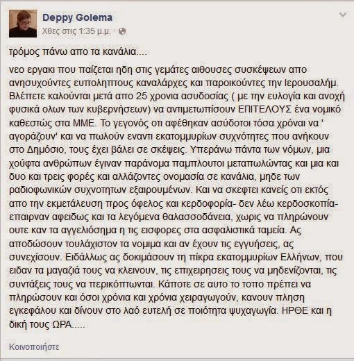Η έγκυρη τηλεκριτικός τιτλοφορεί το κείμενο που ανήρτησε στην προσωπική της σελίδα στο Facebook «τρόμος πάνω απο τα κανάλια….» και όπως τονίζει πρόκειται για ένα «νέο εργάκι που παίζεται ήδη στις γεμάτες αίθουσες συσκέψεων από ανησυχούντες ευπόληπτους καναλάρχες…