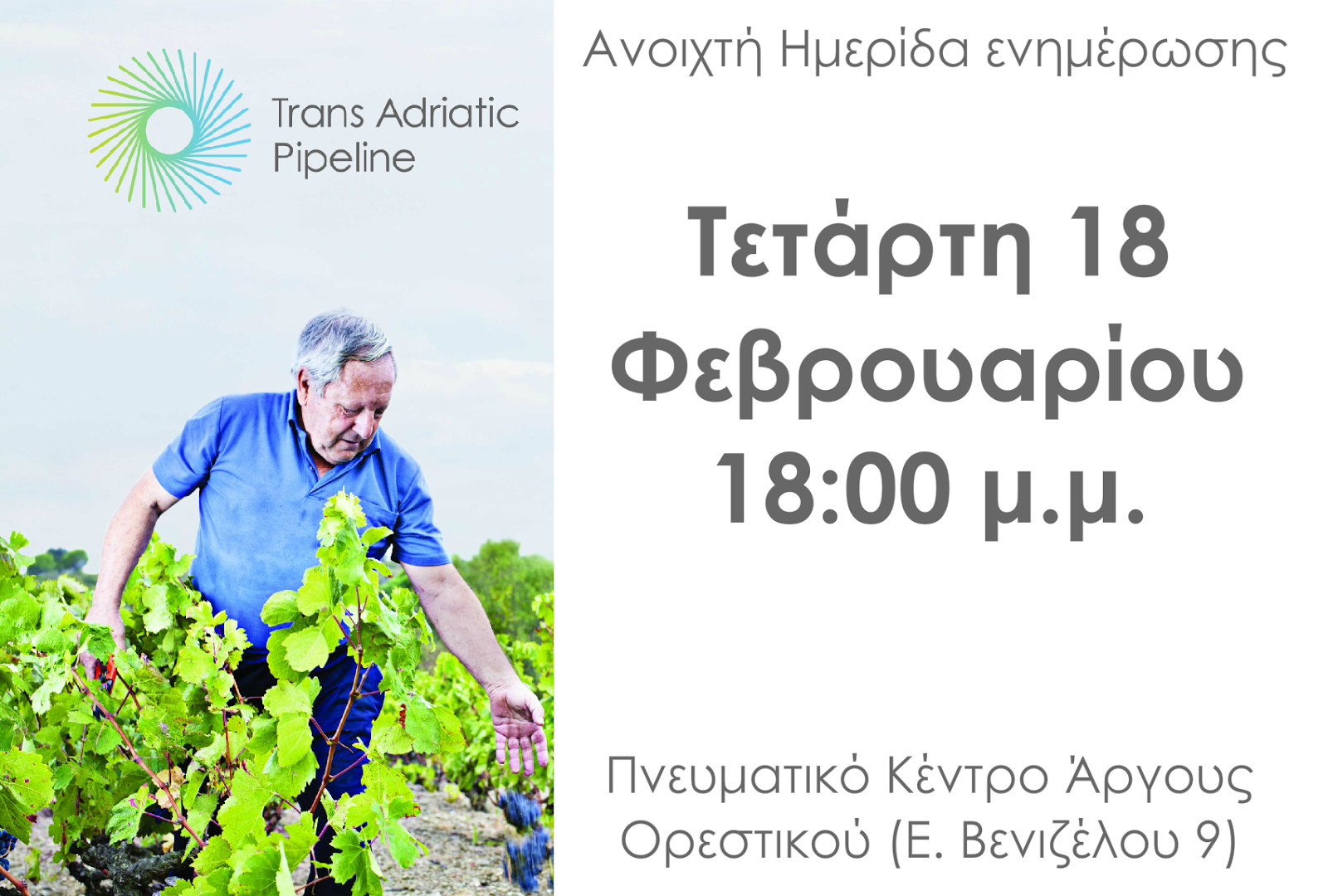 Αθήνα, 16/2/2015. Ο Διαδριατικός Αγωγός Φυσικού Αερίου – ΤΑP αποτελεί ένα μεγάλο έργο με διαχρονικά οφέλη για την ελληνική οικονομία και τις τοπικές κοινωνίες. Με στόχο την ενημέρωση σχετικά με τη διαδικασία πρόσβασης στη γη για το έργο και τη διαδικασία καταβολής αποζημιώσεων διοργανώνει ανοιχτή συνάντηση την Τετάρτη, 18 Φεβρουαρίου στις 18:00 στο Πνευματικό Κέντρο Άργους Ορεστικού (Ε. Βενιζέλου).