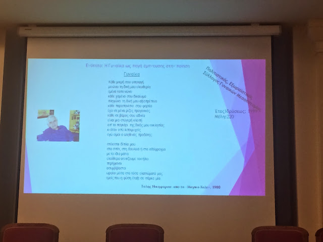 Η κυρία Μαρούλα Βέργου-Γκαμπέση απήγγειλε το εξαιρετικό ποίημα της Γαλάτειας Καζαντζάκη με τίτλο “Αμαρτωλό” κάνωντας ξεχωριστή μνεία στις γυναίκες του περιθωρίου: