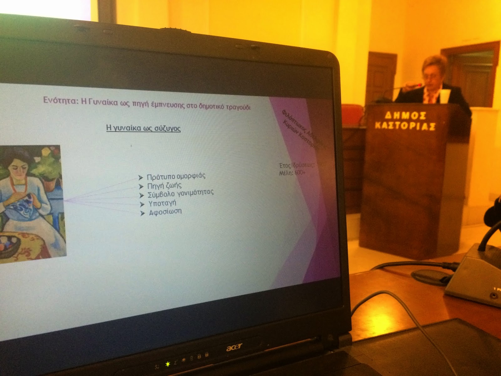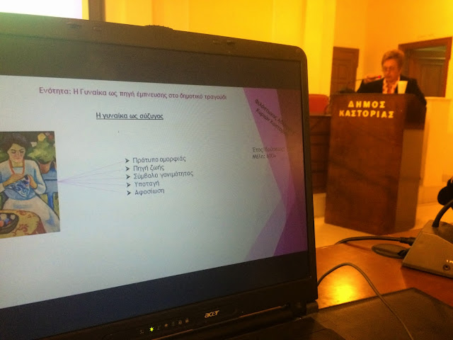 Για τη θέση της γυναίκας στο δημοτικό τραγούδι μίλησαν εκπρόσωποι από τον Πολιτιστικό Σύλλογο Κολοκυνθούς, τη Φιλόπτωχο Αδελφότητα Κυριών Καστοριάς και την Εύξεινο Λέσχη Καστοριάς.