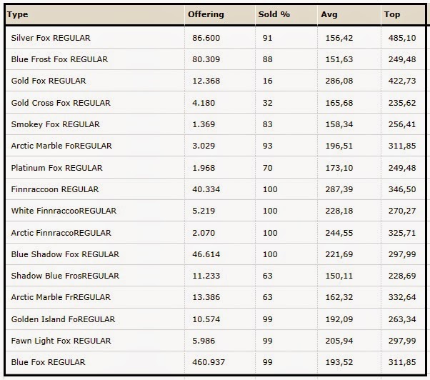 Στα Blue Frost fox πουλήθηκε το 60% σε σταθερές τιμές σε σχέση με το Δεκέμβριο. Τα Blue Frost fox πουλήθηκαν σε ποσοστό 80% σε ελαφρώς υψηλότερες τιμές σε σύγκριση με το Δεκέμβριο. Τα Golden Island fox πουλήθηκαν σε ποσοστό 90% πωλούνται σε σταθερές τιμές .
