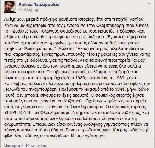 Ένα μήνυμα-μάθημα ιστορίας προς τον Αλέξη Τσίπρα έστειλε μέσω του προσωπικού του λογαριασμού στο Facebook ο Πέτρος Τατσόπουλος, με αφορμή την επίσκεψη του Έλληνα πρωθυπουργού στη Ρωσία και την κατάθεση στεφανιού στο Κρεμλίνο.
