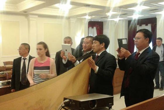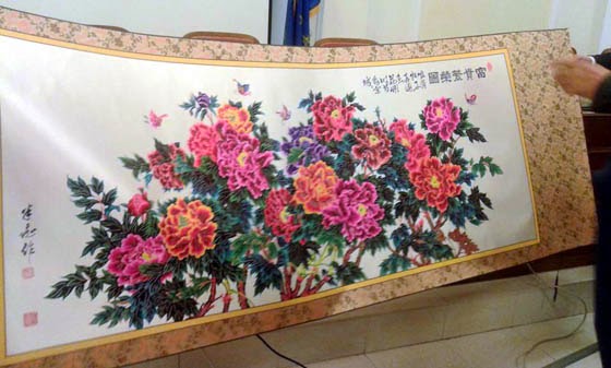 Οι Κινέζοι επισκέπτες προσέφεραν στον δήμαρχο Καστοριάς κ. Ανέστη Αγγελή ένα παραδοσιακό, χειροποίητο μεταξωτό.