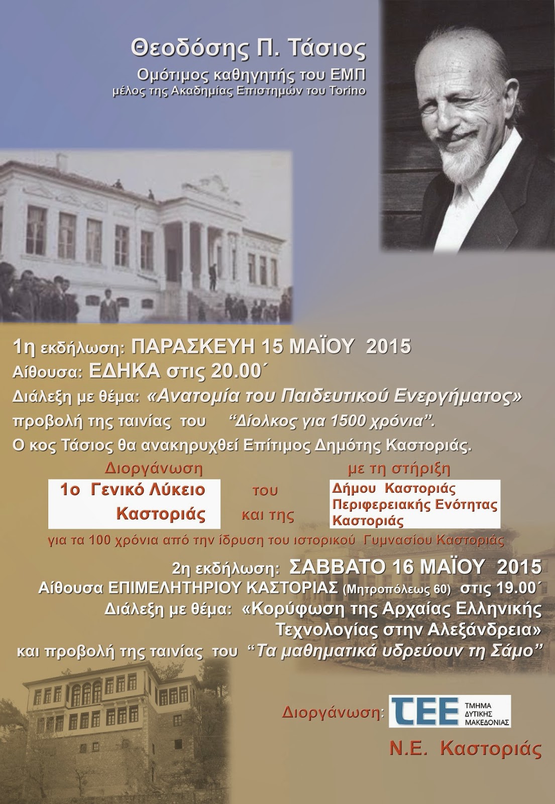 2) Στις 19.00΄ (εκδήλωση ΤΕΕ Δ.ΜΑΚΕΔΟΝΙΑΣ-ΝΕ Καστοριάς): διάλεξη στην αίθουσα του ΕΠΙΜΕΛΗΤΗΡΙΟΥ (Μητροπόλεως 60) με θέμα ” Κορύφωση της Αρχαίας Ελληνικής Τεχνολογίας στην Αλεξάνδρεια” και προβολή της ταινίας του “Τα μαθηματικά υδρεύουν τη Σάμο”.