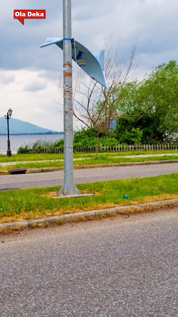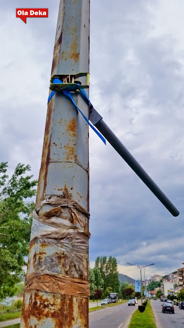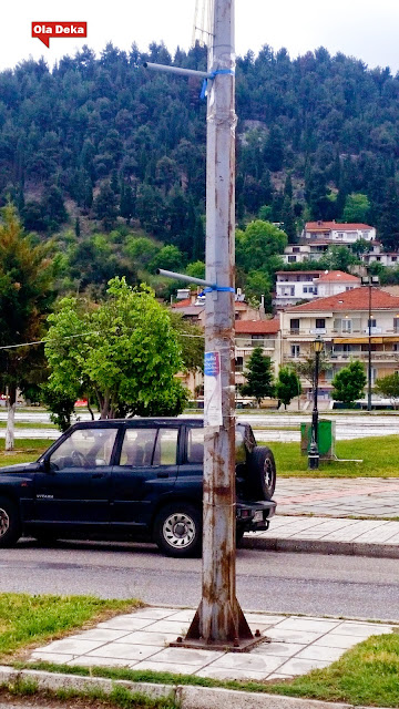 Εκτός του θέματος ρύπανσης μιας πόλης που προσπαθεί να πουλήσει μια εικόνα καθαρού, αρχοντικού και φυσικού περιβάλλοντος (δείτε την ασχήμια σε όλο της το μεγαλείο) σήμερα έτυχε ο στρατηγός αέρας να εκθέσει και άλλο τους αρμόδιους του δήμου Καστοριάς. Τα δυνατά μποφόρ ξέσκισαν ακόμη και τις πολύ δυνατές κατασκευές δεσίματος πάνω στους στύλους φωτισμού στην κύκνων. Αυτό το δυνατό δέσιμο όμως λειτουργεί ακόμη πιο επικίνδυνα όταν ο αέρας ή κάποια άλλη δύναμη τα νικήσει. Όταν αυτοί οι σιδηρολοστοί που δέθηκαν με πανίσχυρους ιμάντες και μεταλλικές καστάνιες πάνω στους στύλους σπάσουν και εκσφενδονιστούν με μανία στον αέρα, τότε γίνονται φονικά όργανα που αιωρούνται διαβολικά και …όποιον πάρει ο χάρος. Φανταστείτε ένα από αυτά τα σιδερικά να αποκολληθεί και με δύναμη να προσγειωθεί στο παρμπρίζ διερχόμενου οχήματος (που έχει και αυτό την ταχύτητα του, άρα πολλαπλασιάζει τη σφοδρότητα της σύγκρουσης) ή στο κεφάλι ενός παιδιού που τυχαίνει να βαδίζει εκείνη τη στιγμή στο σημείο.
