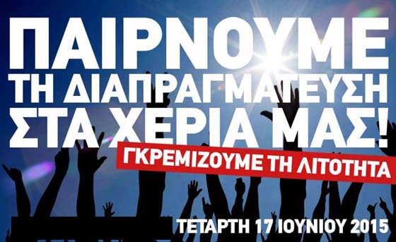 Δεν αντέχουμε μισθούς και συντάξεις 300 ευρώ, σπίτια χωρίς θέρμανση, τους γονείς μας χωρίς φάρμακα, τα παιδιά μας νηστικά στα σχολεία, για να πληρώνεται χωρίς τέλος ένα χρέος που δεν δημιουργήσαμε εμείς. Οι δανειστές δεν ζητάνε μόνο αυτά, αλλά πολλά περισσότερα με στόχο να εγκλωβίσουν την οικονομία σε ασφυξία και την κοινωνία σε αδιέξοδα.