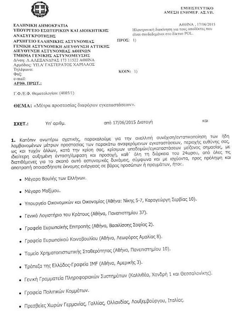 Η διαταγή που αποκαλύπτει ο «Ελεύθερος Τύπος» της Κυριακής με ημερομηνία 17 Ιουνίου 2015 προβλέπει την 24ωρη επιτήρηση των παρακάτω «κρίσιμων υποδομών και εγκαταστάσεων»: Βουλή των Ελλήνων, Μέγαρο Μαξίμου, υπουργείο Οικονομικών και Οικονομίας, Γενικό Λογιστήριο του Κράτους, Γραφεία Ευρωπαϊκής Επιτροπής, Γραφεία Ευρωπαϊκού Κοινοβουλίου, Ταμείο Χρηματοπιστωτικής Σταθερότητας, Τράπεζα της Ελλάδος – IMF, Γενική Γραμματεία Πληροφοριακών Συστημάτων, Γραφεία Πολιτικών Κομμάτων, μεγάλοι τηλεοπτικοί σταθμοί, γνωστά ξενοδοχεία του κέντρου της Αθήνας, όπως και πρεσβείες χωρών Γερμανίας, Γαλλίας, Ολλανδίας, Λουξεμβούργου και Ιταλίας.