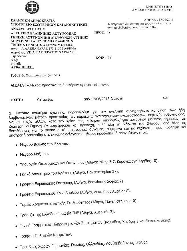 Η διαταγή που αποκαλύπτει ο «Ελεύθερος Τύπος» της Κυριακής με ημερομηνία 17 Ιουνίου 2015 προβλέπει την 24ωρη επιτήρηση των παρακάτω «κρίσιμων υποδομών και εγκαταστάσεων»: Βουλή των Ελλήνων, Μέγαρο Μαξίμου, υπουργείο Οικονομικών και Οικονομίας, Γενικό Λογιστήριο του Κράτους, Γραφεία Ευρωπαϊκής Επιτροπής, Γραφεία Ευρωπαϊκού Κοινοβουλίου, Ταμείο Χρηματοπιστωτικής Σταθερότητας, Τράπεζα της Ελλάδος – IMF, Γενική Γραμματεία Πληροφοριακών Συστημάτων, Γραφεία Πολιτικών Κομμάτων, μεγάλοι τηλεοπτικοί σταθμοί, γνωστά ξενοδοχεία του κέντρου της Αθήνας, όπως και πρεσβείες χωρών Γερμανίας, Γαλλίας, Ολλανδίας, Λουξεμβούργου και Ιταλίας.