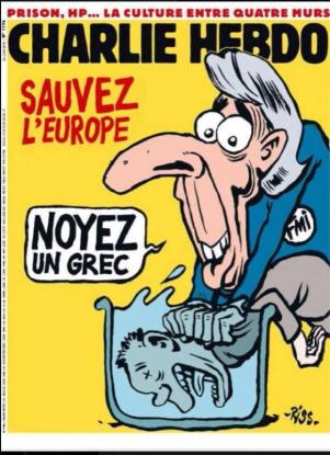 Με τον τίτλο στο πρωτοσέλιδό του «Σώστε την Ευρώπη – Πνίξτε έναν Έλληνα» κυκλοφορεί το γαλλικό περιοδικό Charlie Hebdo και με ένα εντυπωσιακό σκίτσο όπου το ΔΝΤ πνίγει σε έναν κουβά γεμάτο νερό έναν Έλληνα.
