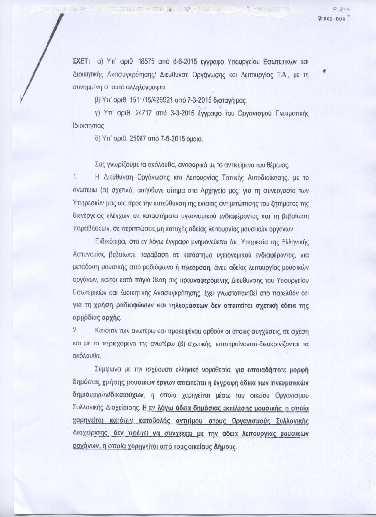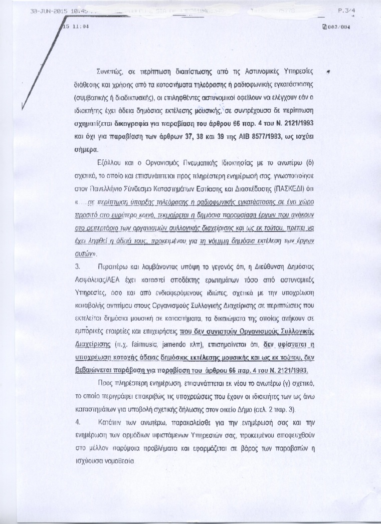 Η Αστυνομία δεν θα κάνει μηνύσεις για άδεια μουσικών οργάνων καθώς ενημερώθηκε ότι δεν απαιτείται.
