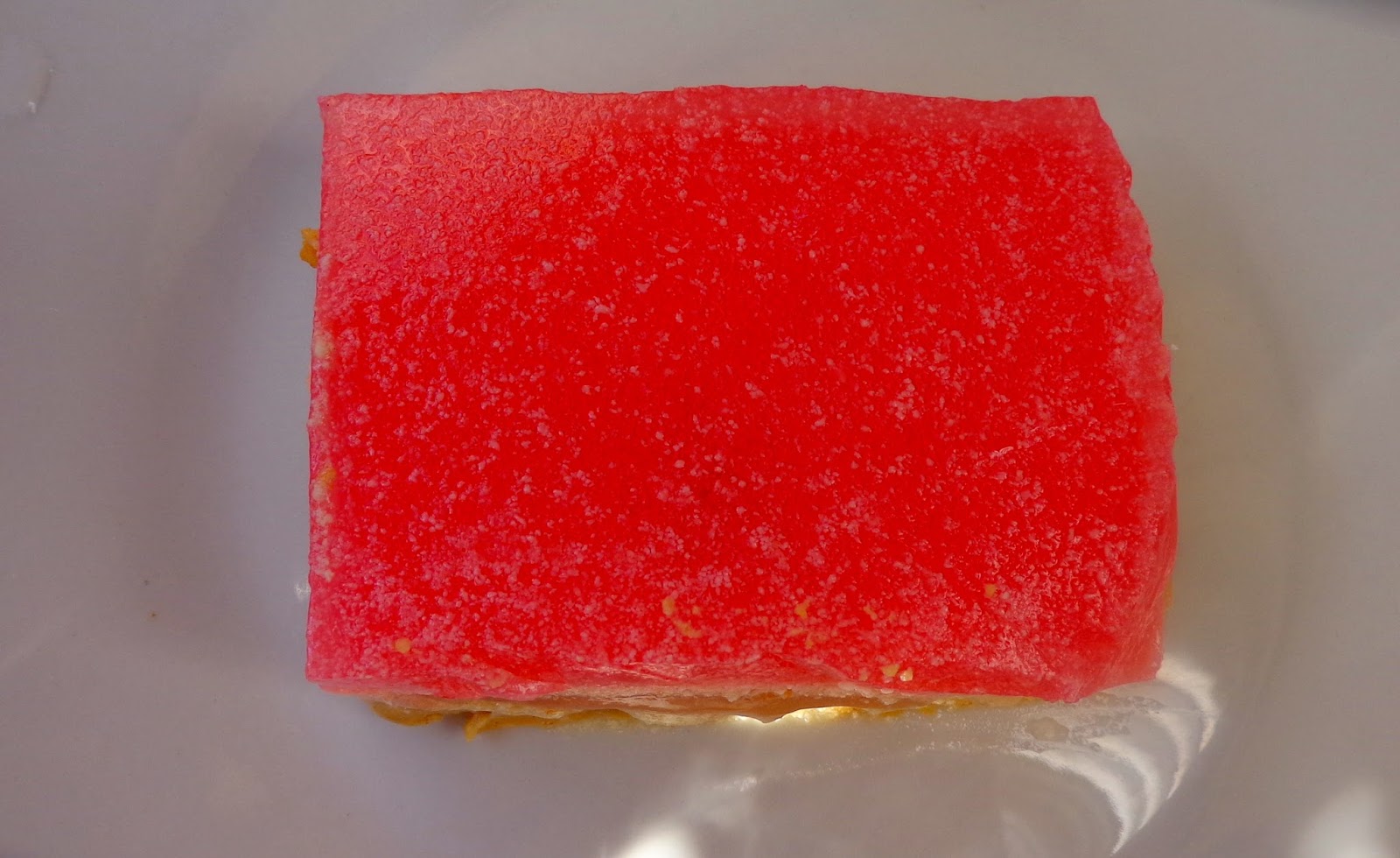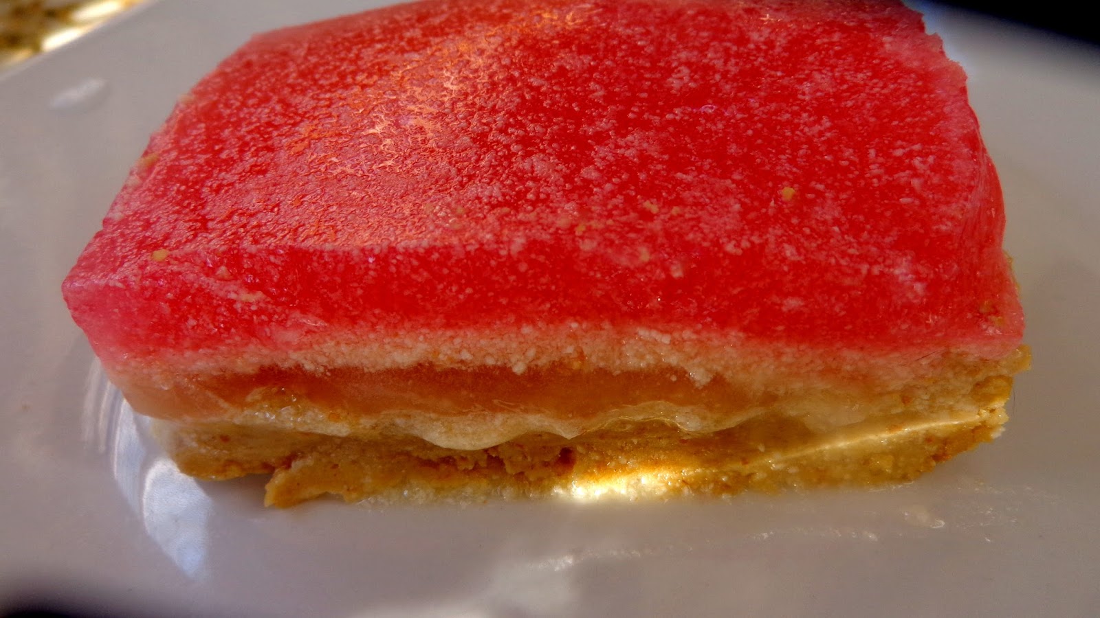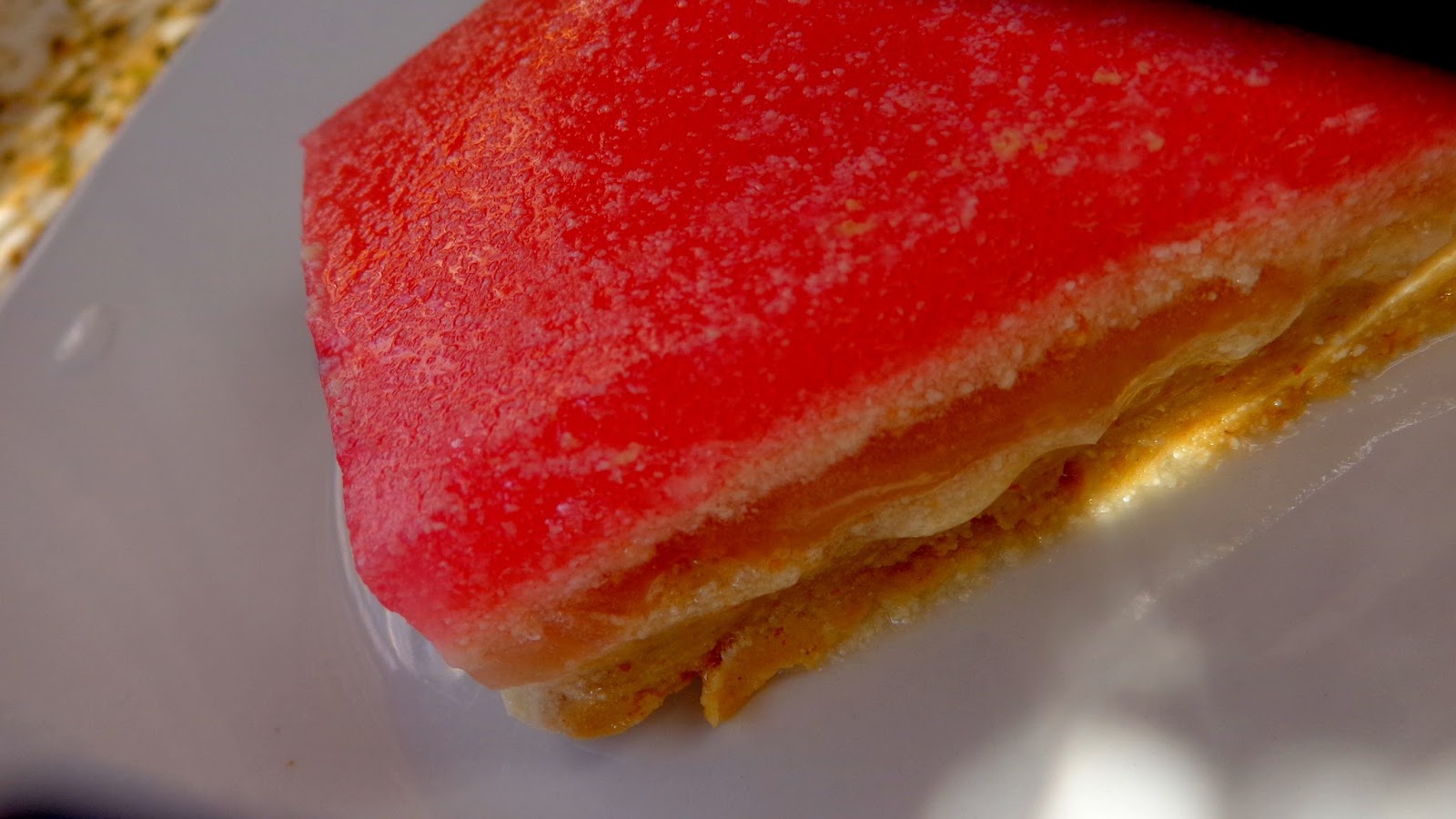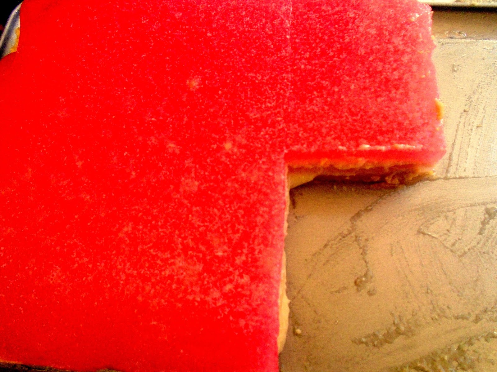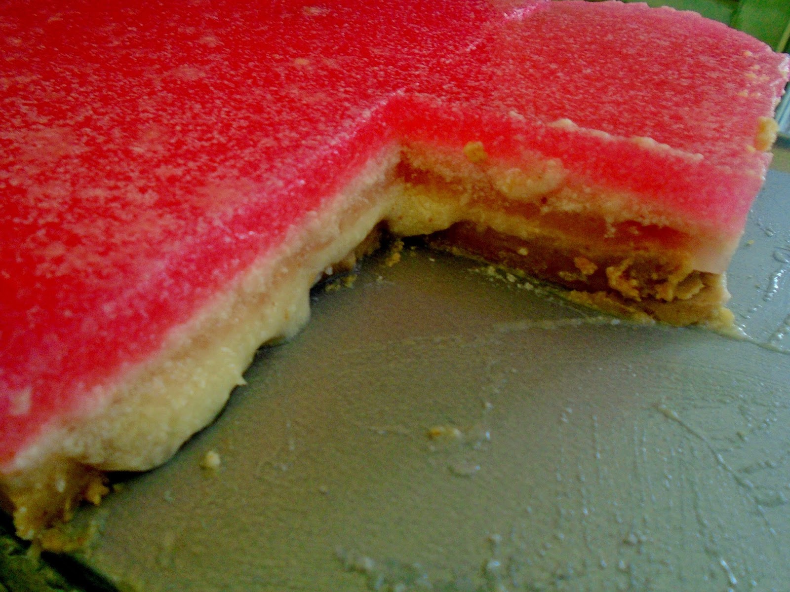Το αφήνουμε να κρυώσει λίγο και με την βοήθεια μιάς κουτάλας όχι κατ ευθείαν ( θα τρυπήσει την κρέμα) το ρίχνουμε ομοιόμορφα επάνω από την κρέμα