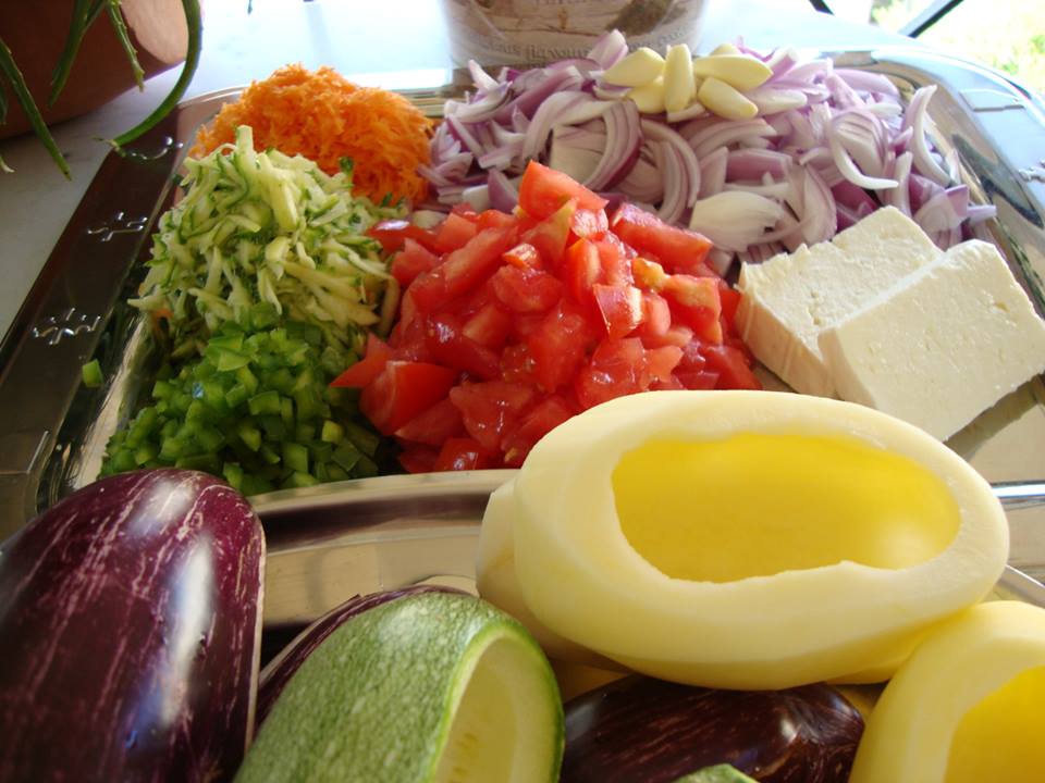 1) Πλένουμε και καθαρίζουμε όλα τα λαχανικά μας τις μελιτζάνες τις χαράζουμε τα κολοκυθάκια και τις πατατες τα ανοίγουμε σαν να κάνουμε γεμιστά και όλα μαζί τα τηγανίζουμε ελαφρώς και τα βάζουμε σε ένα σουρωτήρι μέχρι να γίνει η γέμιση τους