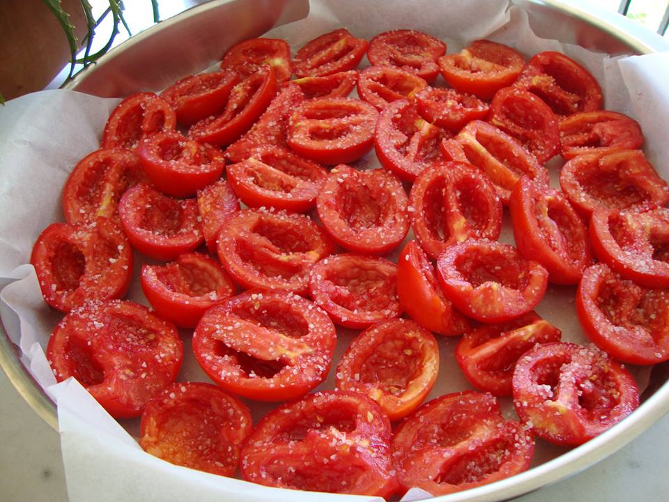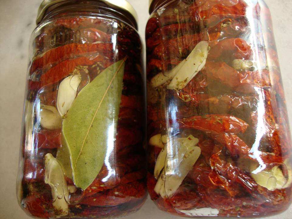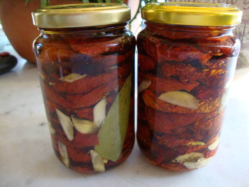 και τα βάζουμε να στραγγίσουν για μια ωρίτσα ρίχνοντας από πάνω τους λίγο αλατι. στην συνέχεια σε ένα ταψί βάζουμε μια λαδόκολλα και τα στρώνουμε όλα δίπλα δίπλα τα βάζουμε στον φούρνο στους 100-120 και τα στεγνώνουμε για 3 ώρες περίπου κοιτάζοντας αν θέλουν γύρισμα να φύγουν τα υγρά και αν κάποια είναι έτοιμα λίγο νωρίτερα!!!! τα βάζουμε σε αποστειρωμένα βαζάκια ρίχνοντας ενδιάμεσα σκορδάκι και μερικά φύλλα δάφνης και την ρίγανη ι !!! και είναι έτοιμα!!! καλή σας επιτυχία!!! την συνταγή μου την έδωσε η Poly Fitz από τους κουζινίστας και ευχαριστώ πολύ!