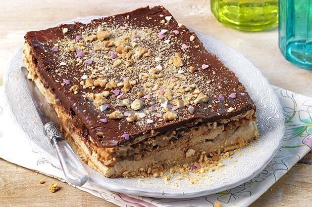 4. Απλώνουμε την υπόλοιπη κρέμα και τις υπόλοιπες μπανάνες. Τέλος, καλύπτουμε με μια στρώση πτι μπερ και απλώνουμε όλη την επικάλυψη σοκολάτας. Παγώνουμε για 4-5 ώρες ή μια νύχτα.