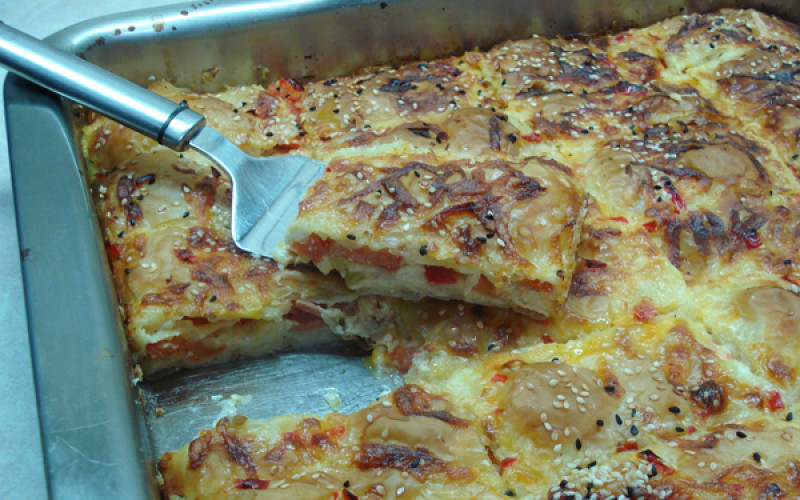 Κόβουμε το φύλλο στην μέση κάθετα ώστε να βάλουμε το μισό κάτω και το υπόλοιπο πάνω από την γέμιση. Λιώνουμε το βούτυρο και βουτυρώνουμε ένα ταψί. Στρώνουμε τα φύλλα που θα χρησιμοποιήσουμε για τον πάτο του ταψιού βουτυρώνοντας καλά. Βάζουμε όλα τα υλικά με την σειρά (εκτός το γάλα και τα αυγά), κρατάμε λίγο ρεγκάτο και κόκκινη πιπεριά για το τέλος. Καλύπτουμε με τα υπόλοιπα φύλλα βουτυρώνοντας καλά και κόβουμε σε κομμάτια την πίτσα. Χτυπάμε τα αυγά μαζί με το γάλα και περιχύνουμε την πίτσα μας. Τέλος πασπαλίζουμε με το τυρί και την πιπεριά που κρατήσαμε, ενώ αν θέλουμε πασπαλίζουμε και με σουσάμι. Αφήνουμε για 10 λεπτά να απορροφηθούν τα υγρά και ψήνουμε σε προθερμασμένο φούρνο στους 180 βαθμούς για 45 λεπτά περίπου, μέχρι να ροδίσει καλά (ανάλογα τον φούρνο μας). Αφήνουμε λίγο να κρυώσει κι είναι έτοιμη να την απολαύσουμε.