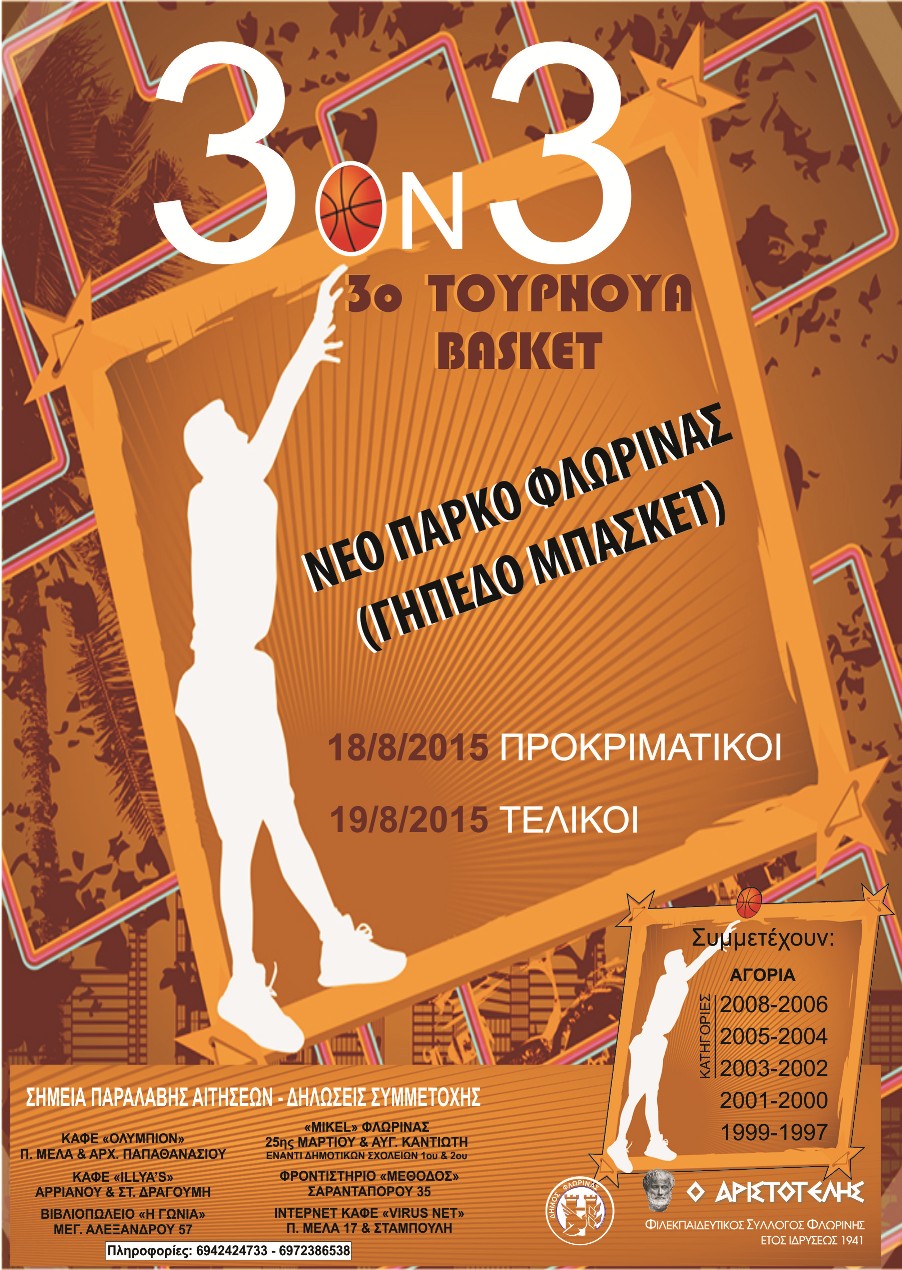 Στο πλαίσιο των εκδηλώσεων «ΠΟΛΙΤΙΣΤΙΚΑ ΔΡΩΜΕΝΑ 2015» του Δήμου Φλώρινας το τμήμα καλαθοσφαίρισης του Φ.Σ.Φ. «Ο Αριστοτέλης» οργανώνει την Τρίτη 18 και Τετάρτη 19 Αυγούστου 2015 στο Νέο Πάρκο Φλώρινας το 3ο 3on3 Τουρνουά Basket για αγόρια 7 έως 18 ετών.