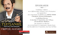Οι Εκδόσεις «Λιβάνη» και το βιβλιοπωλείο «Η Γωνιά» του Β. Παπαγιάννη σας προσκαλούν στην παρουσίαση του βιβλίου του ΓΙΩΡΓΟΥ ΛΙΑΝΗ «Τσιτσάνης: Αιώνιος Καλπασμός».