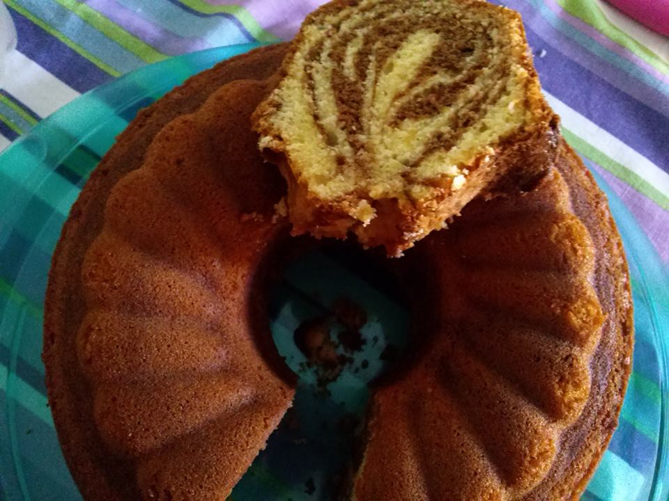 Παίρνουμε μετά μισή κούπα από το μείγμα κακάο και το ρίχνουμε πάνω από το λευκό στο κέντρο πάλι . Περιμένουμε λίγο να απλώσει. Αυτό θα συνεχίζουμε να κάνουμε μέχρι να τελειώσουν και τα 2 μείγματα με ηρεμία και χωρίς βιασύνη. Θα το επαναλάβουμε 5 φορές με τη μισή κούπα κακάο και 6 φορές με τα ¾ της κούπας λευκό μείγμα, ρίχνοντας πάντα κέντρο του ταψιού ή της φόρμας και περιμένοντας λίγο για να απλώσει. Τελειώνουμε με λευκό μείγμα.