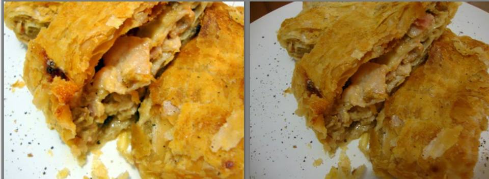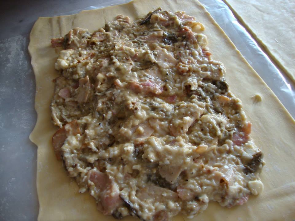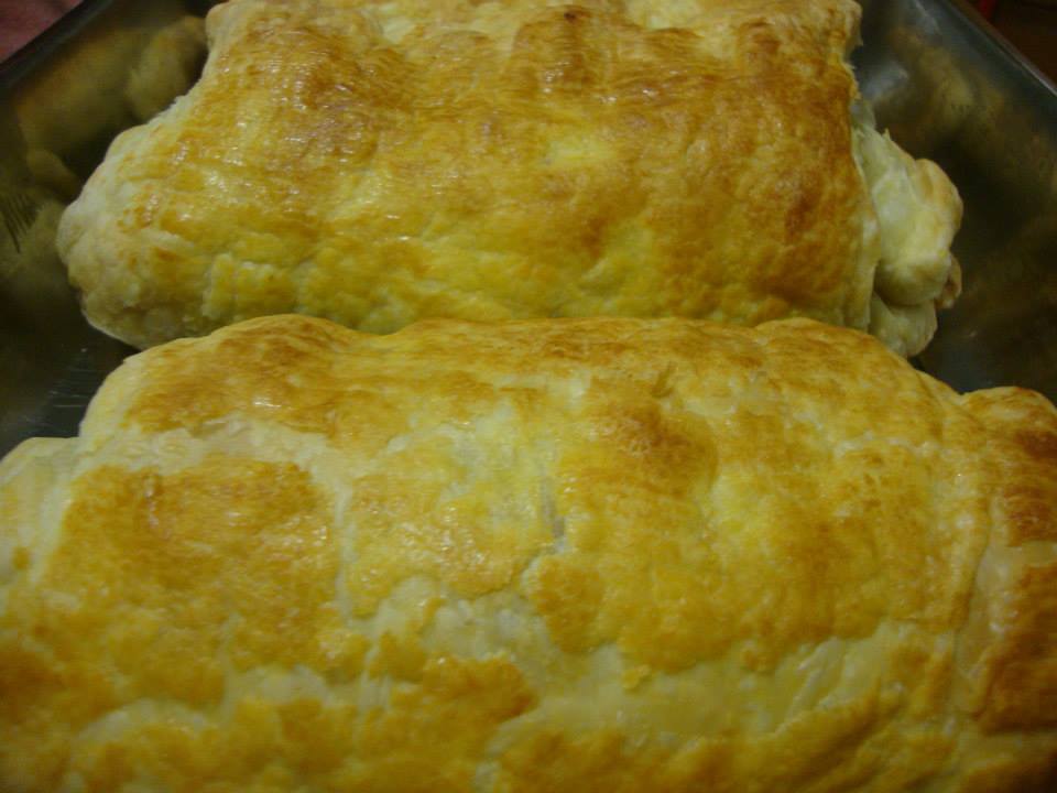 ανοίγουμε την συσκευσια με την σφολιάτα και πάνω στην ζελατίνα που είναι απλώνουμε λιγάκι ακόμα το φύλλο να μεγαλώσει και το κόβουμε στην μέση για να μας βγουν 4 Ρολάκια χαράζετε και την ζελατίνα για να σας βοηθήσει να κάνετε τα ρολάκια σας!!! χωρίζετε την γέμιση στα 4 και απλώνετε πάνω στα φύλλα κλείνοντας λιγάκι τα πλαϊνά και με την βοήθεια της ζελατίνας τα κάνετε ρολάκια!!! τα αλείφετε με ένα κρόκο αβγού που έχετε προσθέσει μερικές σταγονες λάδι .