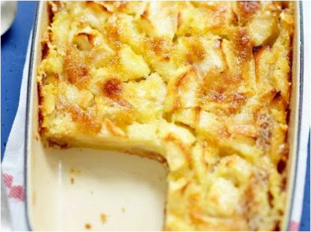 Αδειάζουμε το μείγμα πάνω στα μήλα και ψήνουμε στους 170 °C, σε προθερµασµένο φούρνο, στην τελευταία σχάρα για περίπου 1 ώρα. Αφήνουμε να σταθεί 10΄ και αναποδογυρίζουμε τη μηλόπιτα.