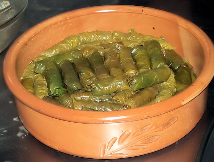 Πλένουμε τα αμπελόφυλλα και τα ζεματάμε για λίγα λεπτά σε βραστό νερό. Τα στραγγίζουμε και τα αφήνουμε να κρυώσουν.