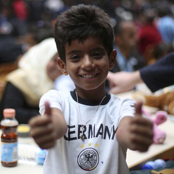 A migrant boy gives thumbs-up in a registration centre at the main railway station in Dortmund, Germany September 6, 2015. REUTERS/Ina Fassbender