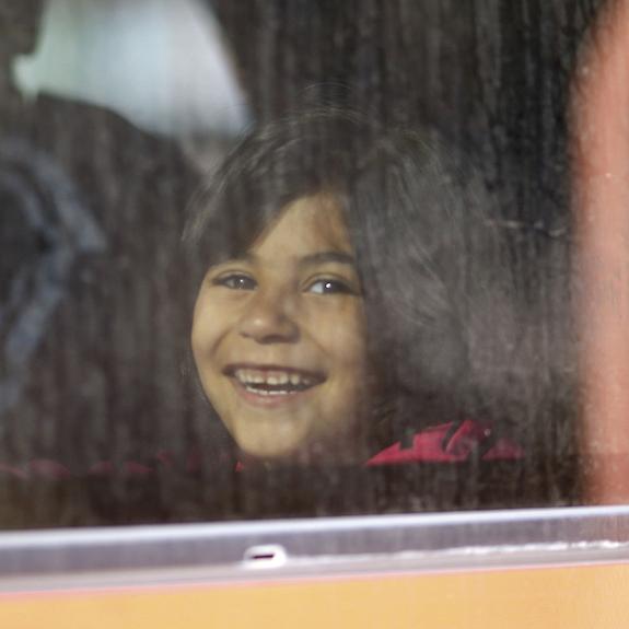 A migrant girl smiles as she looks out through the window of a train bound for Munich via Vienna, at the railway station in Hegyeshalom, Hungary, September 7, 2015. REUTERS/Leonhard Foeger