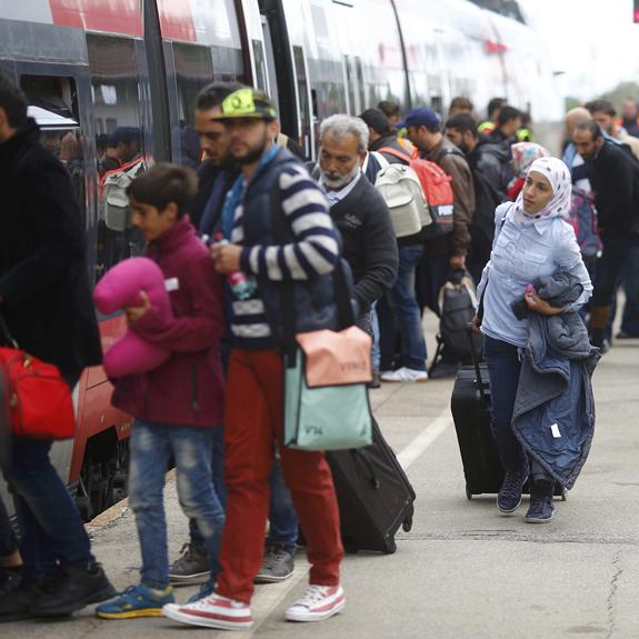 Migrants board a train at the railway station in Nickelsdorf, Austria September 6, 2015. REUTERS/Leonhard Foeger