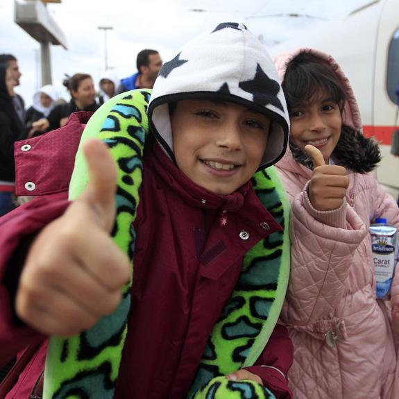 Migrant children from Syria give thumbs-up as they arrive at the main railway station in Dortmund, Germany September 6, 2015. REUTERS/Ina Fassbender