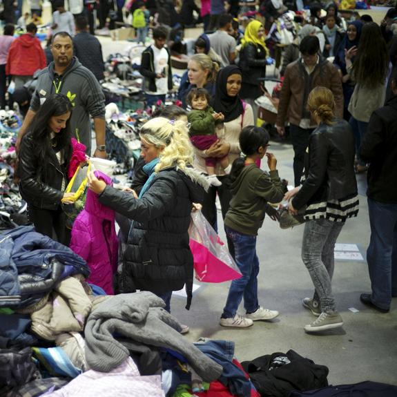 Migrants look for clothes at a distribution centre with donated articles for daily use after their arrival with a train in Dortmund, Germany September 6, 2015. REUTERS/Ina Fassbender