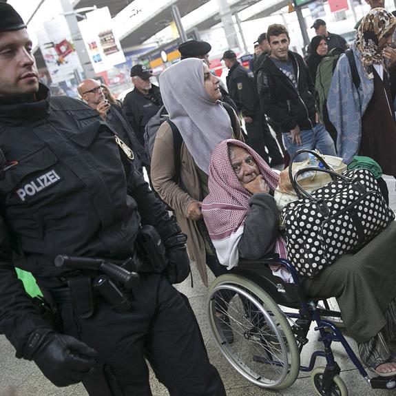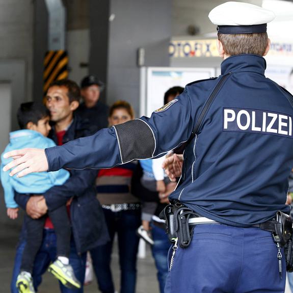 A police officer points the way as migrants arrive by train at the main railway station in Munich, Germany September 7, 2015 REUTERS/Michaela Rehle